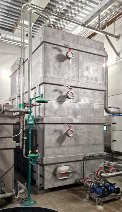 Exemple de réalisation par l’ECTA : Fabrication dans leur atelier en deux parties d’une cuve pour de l’eau chargée en tôle inox épaisseur 6 mm de dimension hauteur 4 m, longueur 3.2 m et largeur 2 m. Assemblage final sur le site du client. Liaison de la tuyauterie d’alimentation DN 80, de la tuyauterie d’évent DN 100 ainsi que de la tuyauterie d‘évacuation avec installation d’une double pompe et sonde de niveaux.