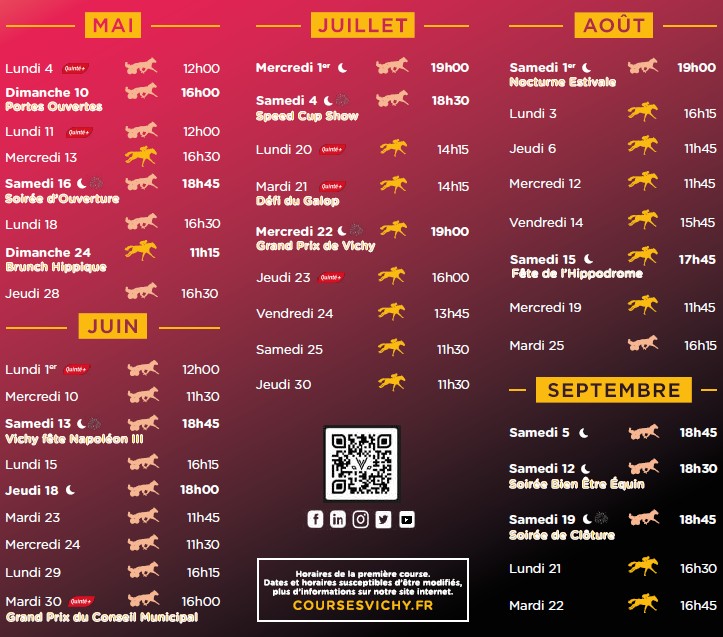 La programmation s’annonce riche, avec des temps forts incontournables : Festival du Trot, Festival du Galop, Grand Prix de Vichy, soirées nocturnes, feux d’artifice, événements familiaux et animations festives tout au long de l’été.