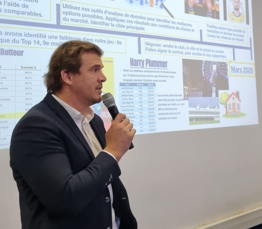 De son côté, Aurélien Rougerie, ancien joueur et chargé de recrutement au club, a partagé son retour d’expérience sur l’évolution de la data dans le rugby, et son rôle désormais central dans les décisions de recrutement. La donnée devient un véritable outil d’aide à la décision, permettant d’objectiver les choix et de réduire les incertitudes.