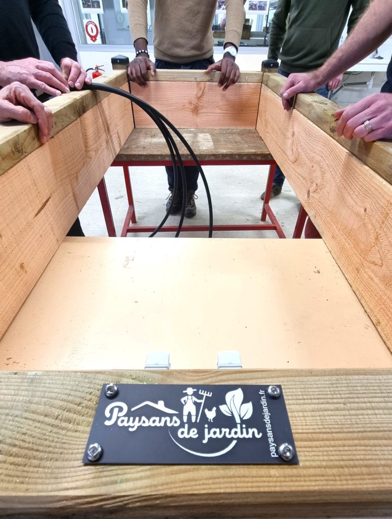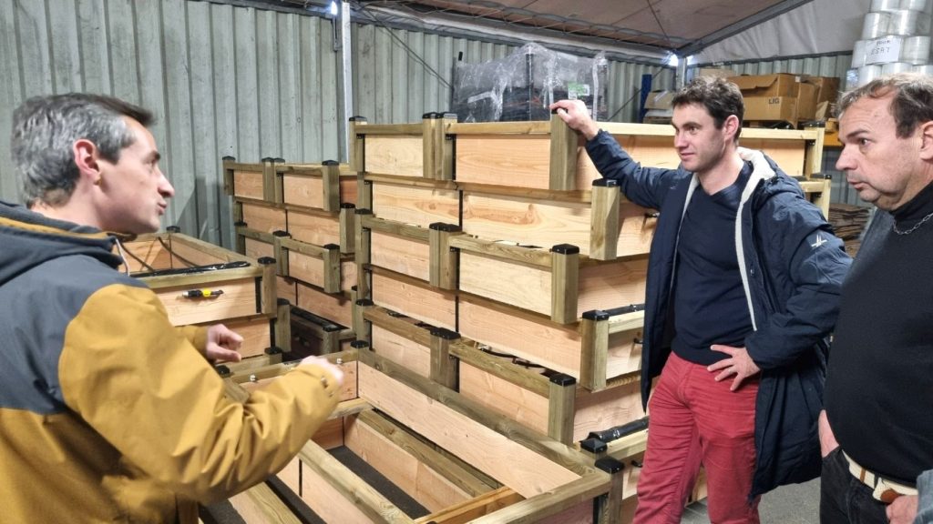 Maxime Occhipinti, Henri Landes et Stéphane Fouillot devant des potagers en cours de montage