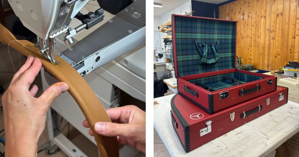 Chaque pièce signée Laurent Nay – Maison Victor est pensée comme un prolongement du véhicule : bagages coordonnés à la sellerie intérieure, marquage à chaud, broderies, choix infini de cuirs et de tissus… En moyenne, 12 heures de travail sont nécessaires pour créer un produit unique, destiné à une clientèle internationale. « 90 % des commandes partent à l’étranger », précise Mathis.