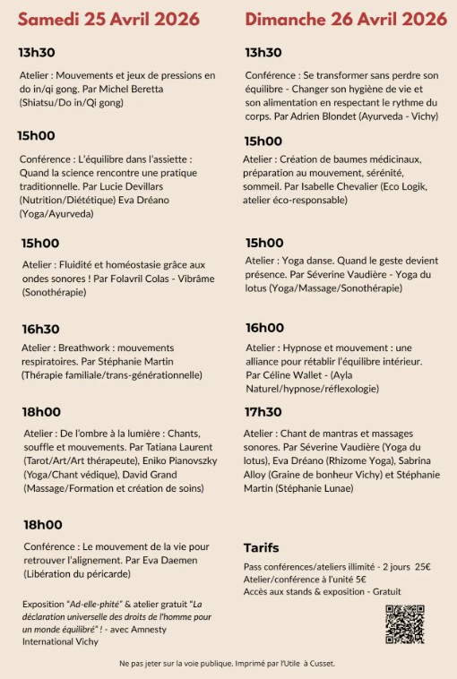 Les après-midi auront lieu les ateliers et conférences accessibles au public (payant) et l’accès aux stands (20 à 30 exposants) des praticiens du bien-être (visite libre).