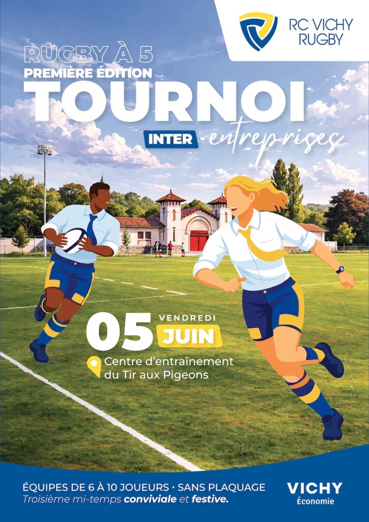 Le RC Vichy Rugby organise la 1ère édition de son Tournoi Inter-Entreprises le vendredi 5 juin 2026 à partir de 18h, au centre d’entraînement – Stade du Tir aux Pigeons à Bellerive-sur-Allier.